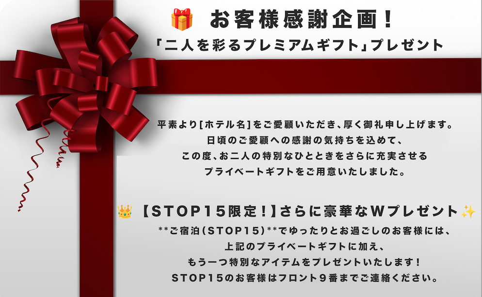只今、特別料金中につき、お客様感謝企画としてプレゼントをご用意しております。